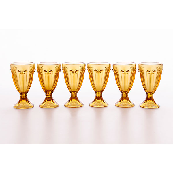 Jogo 06 taças água borboleta ambar Dimensão produto: Diam: 8,3 x alt: 15 cm Capacidade: 240 ml Material: Vidro