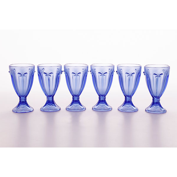 Jogo 06 taças água borboleta azul Dimensão produto: Diam: 8,3 x alt: 15 cm Capacidade: 240 ml Material: Vidro